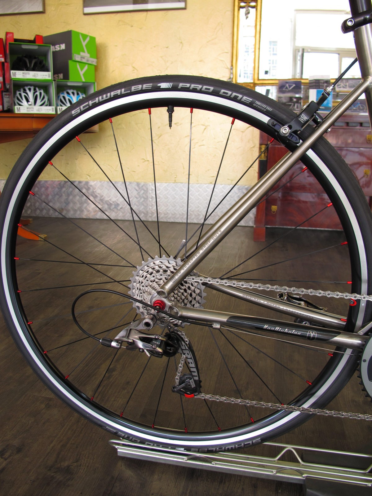 Die Zutaten für das personalisierte Hinterrad : Felge : Stans NoTubes ZTR Alpha 340, 28 Loch Nabe : Tune Mag170 Speichen : Sapim CX-Super Nippel : Sapim Alu 1.8mm Pneu : Schwalbe ProOne Tubeless, 23mm Ventil : Schwalbe Tubeless Alu Dichtband : Schwalbe 21 mm Dichtmilch : Schwalbe DocBlue, 45 ml Ab der 28 Loch lässt sich die klassisch bewährte 3-fach tangentiale Einspeichung anwenden.