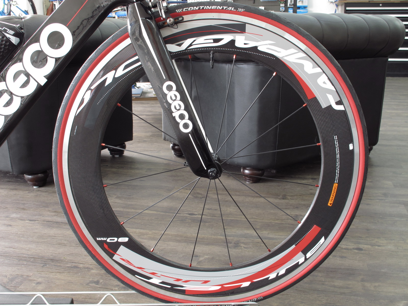 Wuchtig, gallig, sexy, nicht ganz leicht und stets während der Fahrt mit einem vernehmbaren Flüstern gesegnet präsentieren sich diese 80 mm tiefen Campagnolo Bullet Ultra Laufräder. Der in Deutschland gebaute Continental Pneu passt natürlich sehr schön ins Bild.